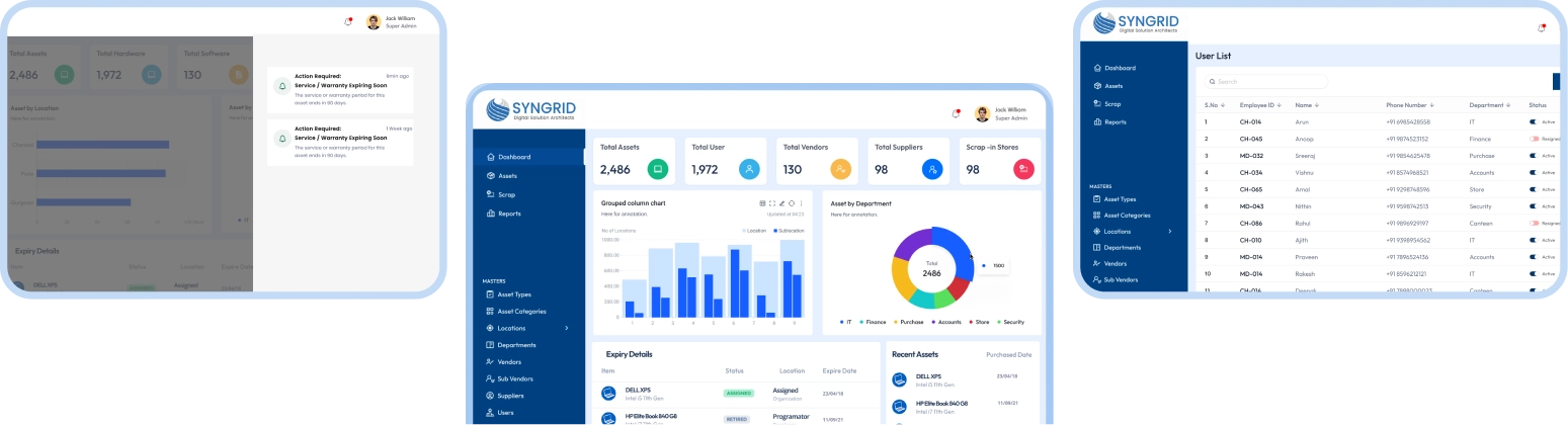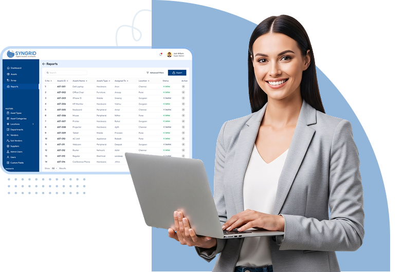 Syngrid Technologies is a leading software development company delivering intelligent, scalable, and secure asset tracking solutions for modern enterprises. Our advanced asset management platform helps businesses manage everything from office furniture like tables and chairs to IT assets such as laptops and devices, automating asset lifecycle management, monitoring usage, optimizing utilization, and ensuring compliance across all locations. Built for startups, mid-sized firms, and large enterprises, our system offers real-time tracking, smart analytics, drag-and-drop custom fields, and flexible integrations to match your operational needs.