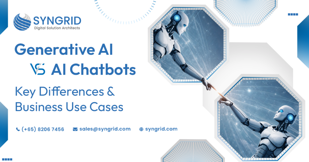 Artificial intelligence is no longer experimental; it is actively shaping how businesses operate, communicate, and scale. Across industries, AI is increasingly used in customer engagement, internal operations, and decision support. However, many organizations still confuse generative AI with AI chatbots, often using the terms interchangeably despite their very different capabilities.