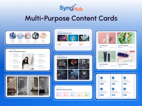 Display content clearly using SyngHub Multipurpose Content Cards, designed for clean, structured, and visually engaging layouts across HubSpot CMS pages.