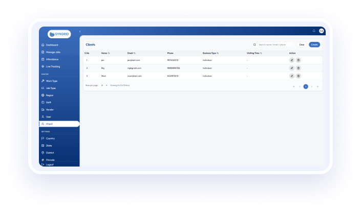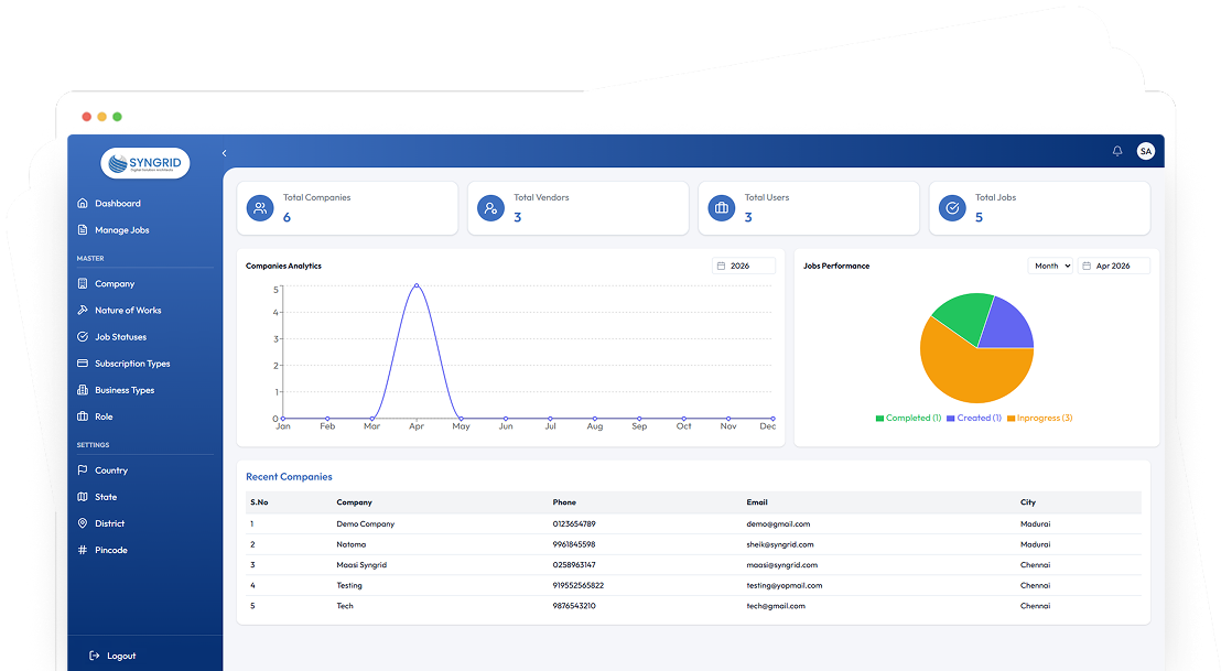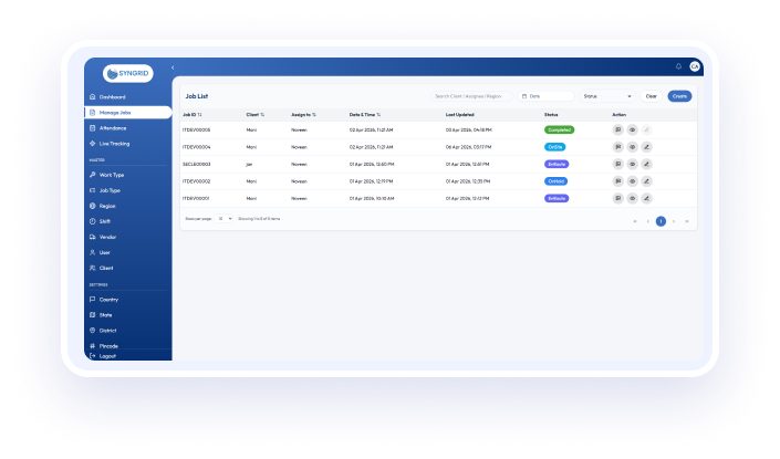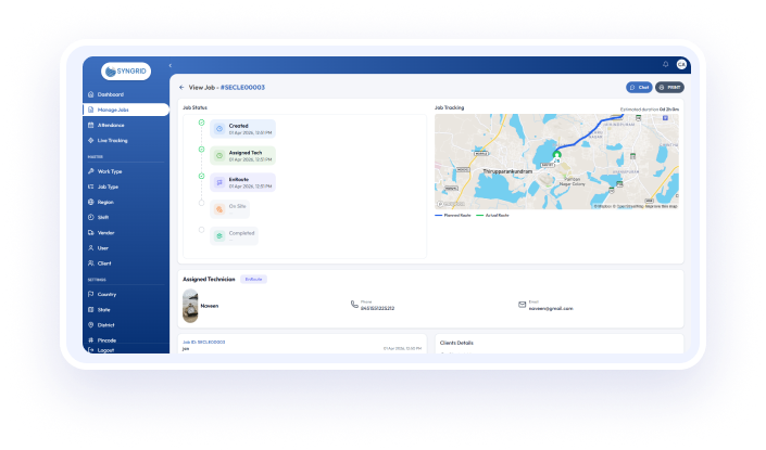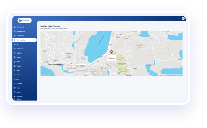The Technician Tracking System by Syngrid is a powerful solution designed to simplify and control field service operations for modern businesses. Built to handle real-world challenges, this platform enables organizations to monitor technician activities, manage job workflows, and maintain complete operational visibility from a single interface. With a structured, role-based approach, in a seamless workflow. Every task is assigned, tracked, and completed with clear accountability, ensuring consistent service delivery across all levels.