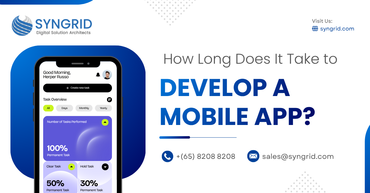 1.Introduction Mobile apps have become the cornerstone of digital business success. From startups to global enterprises, companies rely on apps to connect with customers, streamline operations, and drive revenue. However, one of the most common questions business owners ask is, “How long does it take to develop a mobile app?” The answer depends on factors such as app complexity, features, and development strategy. On average, mobile app development can take anywhere from three to nine months. In this blog, we’ll break down the complete mobile app development timeline and show how Syngrid Technologies helps businesses worldwide deliver faster, high-performing apps. 2. Understanding the Mobile App Development Timeline Every successful mobile app development project follows a strategic and structured approach—from ideation to final launch. Understanding the overall app development timeline helps businesses plan effectively, set realistic expectations, and ensure smooth project execution. The total duration of developing a mobile app typically depends on factors such as project complexity, platform choice (iOS, Android, or cross-platform), and the level of customization required.On average, most apps take three to six months to move from concept to deployment. 3. Step-by-Step Mobile App Development Process 3.1 Step 1: Discovery and Requirement Analysis This is where your app idea transforms into a defined project plan. Teams gather business requirements, identify user personas, and determine key features. At Syngrid, our experts conduct in-depth consultations to align your vision with market trends and technical feasibility. 3.2 Step 2: UI/UX Design Phase In this stage, designers create interactive wireframes and visual prototypes to ensure seamless navigation and user engagement. A clean, intuitive interface improves retention and user satisfaction. Using Figma and Adobe XD, Syngrid’s design team ensures your app is both visually appealing and user-friendly. 3.3 Step 3: App Development This is where the coding begins—both front-end (user-facing) and back-end (server-side). Our developers at Syngrid leverage modern technologies such as Flutter, React Native, and Node.js to build scalable, high-performance apps for Android and iOS. 3.4 Step 4: Testing and Quality Assurance Quality testing ensures that the app performs flawlessly across devices and platforms. Functional, usability, and security tests are conducted to identify and fix bugs before launch. Syngrid uses automated and manual testing to maintain the highest standards of quality. 3.5 Step 5: Deployment and Launch After rigorous testing, the app is deployed to app stores. The process includes app store optimization (ASO), user feedback analysis, and post-launch monitoring. Syngrid ensures a smooth rollout with zero downtime and continuous support. 4. Average Timeframe for Mobile App Development 4.1 Simple Mobile Apps Basic apps with limited functionality (like a calculator or note-taking app) generally take 2–3 months. These are ideal for startups looking to launch quickly. 4.2 Medium-Complexity Apps Apps with moderate features, such as e-commerce or booking platforms, usually take 4–6 months. These projects require database integration, payment systems, and dynamic content. 4.3 Feature-Rich Apps Enterprise-grade or feature-heavy apps—including social media, fintech, or logistics platforms—can take 6–9+ months. These require advanced architecture, multiple integrations, and robust security frameworks. 5. Key Factors That Can Delay App Development 5.1 Scope Changes and Feature Additions Constantly adding new features during development can increase timelines. It’s best to finalize a clear roadmap before coding begins. 5.2 Lack of Clear Requirements or Communication Unclear requirements lead to rework. Syngrid emphasizes transparent communication and detailed documentation to avoid such delays. 5.3 Integration with Third-Party Tools or APIs Integrations with external systems like CRMs, ERPs, or payment gateways can extend timelines depending on API complexity and compliance requirements. 6. How to Speed Up the App Development Process? 6.1 Adopting an Agile Development Approach Agile methodology divides projects into smaller sprints, enabling faster delivery, early testing, and real-time feedback. Syngrid follows Agile practices to ensure iterative progress and flexibility. 6.2 Using Pre-Built Frameworks and Tools Leveraging reusable code components, templates, and low-code tools can significantly reduce development time without compromising quality. 6.3 Partnering with an Experienced Development Team Collaborating with a seasoned development partner like Syngrid Technologies ensures on-time delivery, high-quality output, and end-to-end support—from concept to post-launch maintenance. 7. How Syngrid Technologies Accelerates Mobile App Development? Syngrid Technologies Pte Ltd is a global IT solutions provider with expertise in custom mobile app development, AI integration, Zoho and HubSpot implementation, and digital transformation services. Here’s how Syngrid ensures faster, more efficient app development: Streamlined Processes: Agile workflows and sprint-based execution. Skilled Teams: Certified developers experienced in React Native, Flutter, Kotlin, and Swift. Automation Tools: Continuous integration (CI/CD) pipelines for rapid deployment. Global Delivery Model: Supporting clients across Singapore, India, and worldwide. Syngrid focuses on speed, scalability, and performance, ensuring your app not only launches faster but also delivers long-term value to your users. Conclusion The time it takes to develop a mobile app depends on its complexity, features, and scope but the right development partner can make all the difference.Whether you’re building a simple utility app or a feature-rich enterprise solution, Syngrid Technologies offers end-to-end development expertise that accelerates delivery while mainta